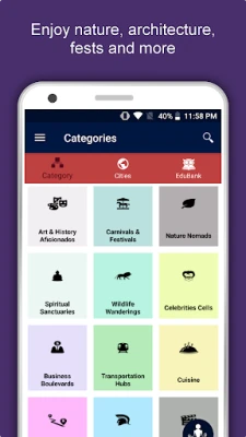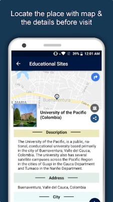 Apart from this, Colombia Travel & Explore guides you Why, When and How to visit various places in Colombia with precise location on the detailed Map. There are three ways to explore this app - Category view, City view and EduBank favorite places view. Pin your destinations and get the routes on the Map. Not only this, you can see exactly how the places look like with Street View integrated in this app. The app also has a feature to Rate and write Review/Experience regarding entity(s) through Login. Your Travel experience and rating will help the user community.