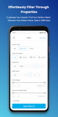 With RealEzy's top-notch app experience, finding your ideal HDB, condo, apartment, landed property, or room rental is effortless. Filter your search based on area, district, proximity to MRT stations, travel time, price, size, number of rooms, and more to find the perfect property that suits your needs.