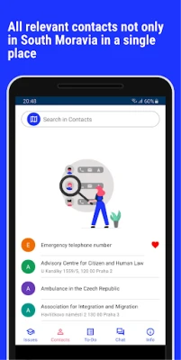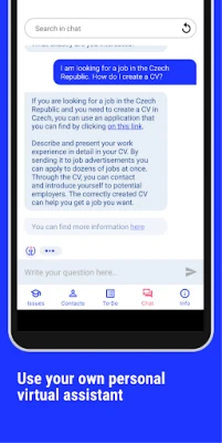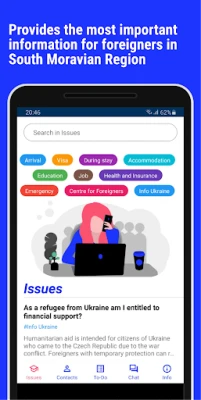 The app provides the most important information on visas and other types of residence in Czechia as well as information on employment, social security, education, health, and other. You will have access to the essential contact information of institutions and organizations (not only) in the South Moravian Region. You can also use your own personal virtual assistant who will answer your questions.